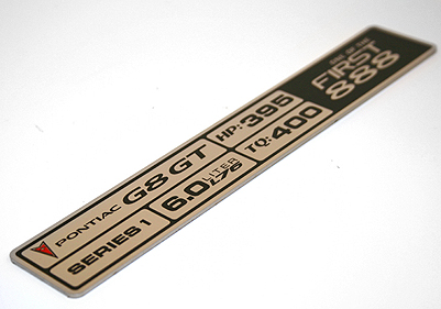 Worded any way you want! Looks great on air lids or dash boards. Include various information like HP/TQ, your name, performance shop logo and more. Fill out the form below to obtain a design proof.